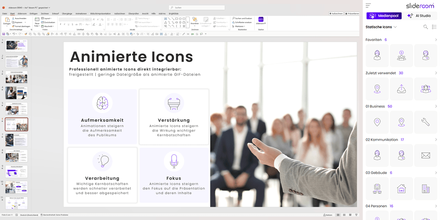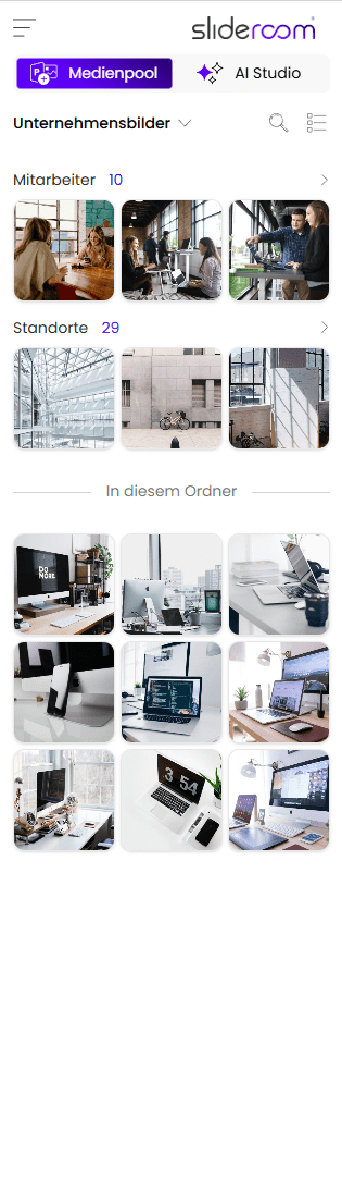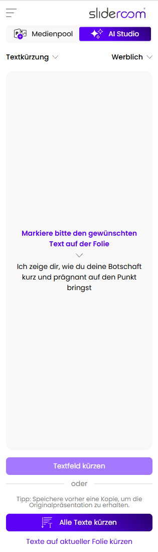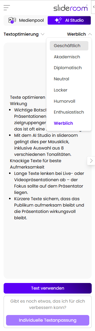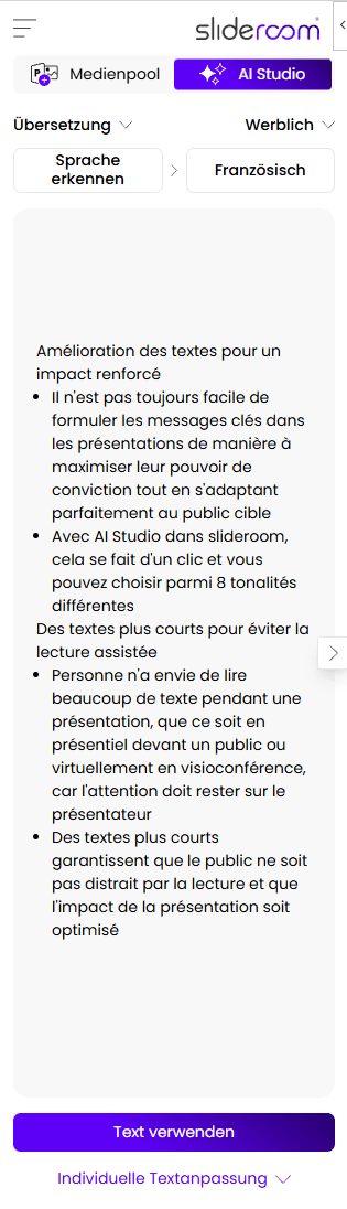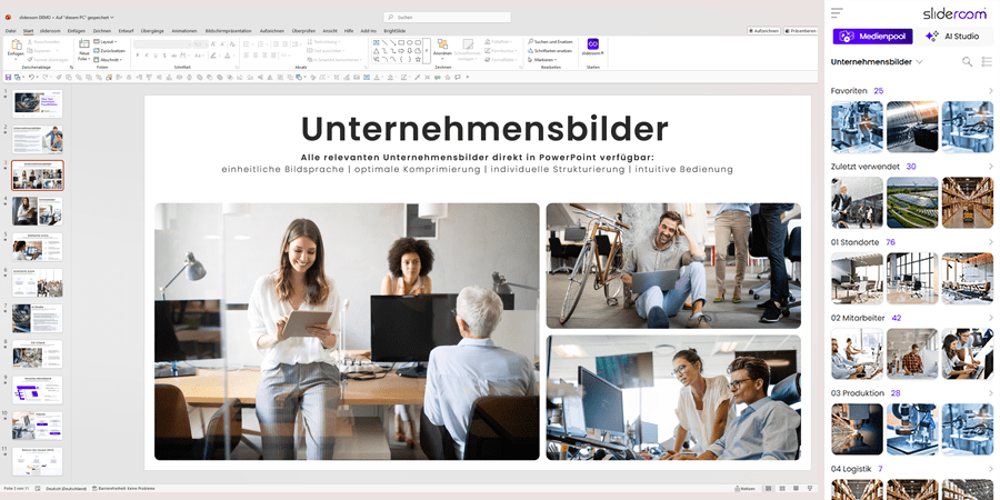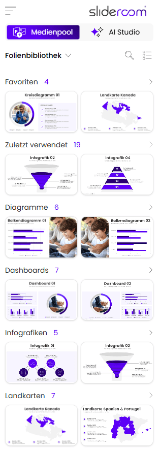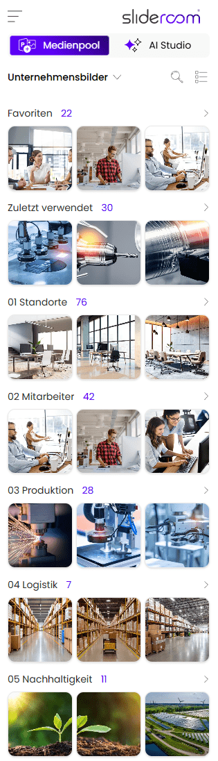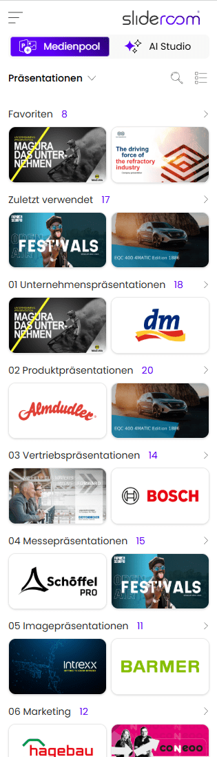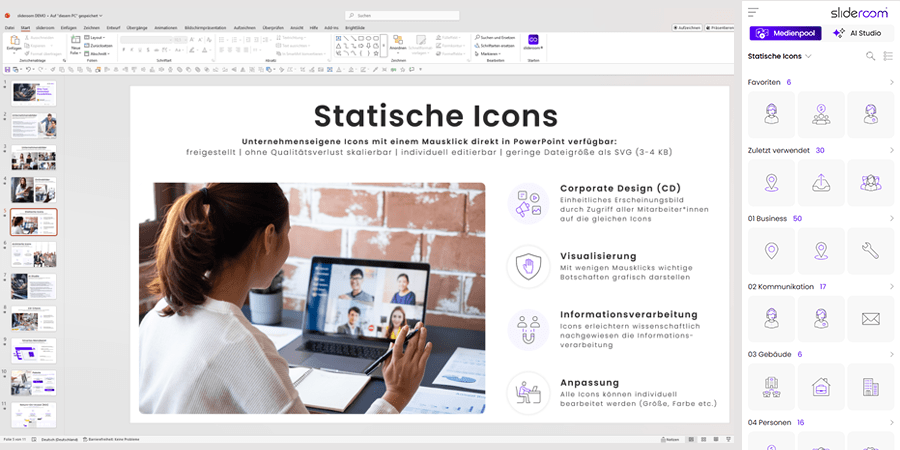 slideroom not only speeds up the creation of presentations, but also raises their quality and persuasiveness to a whole new level: with AI-optimized texts, concise key messages and a visual design through the increased use of images and icons.