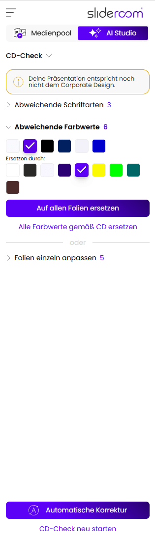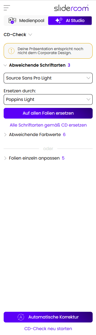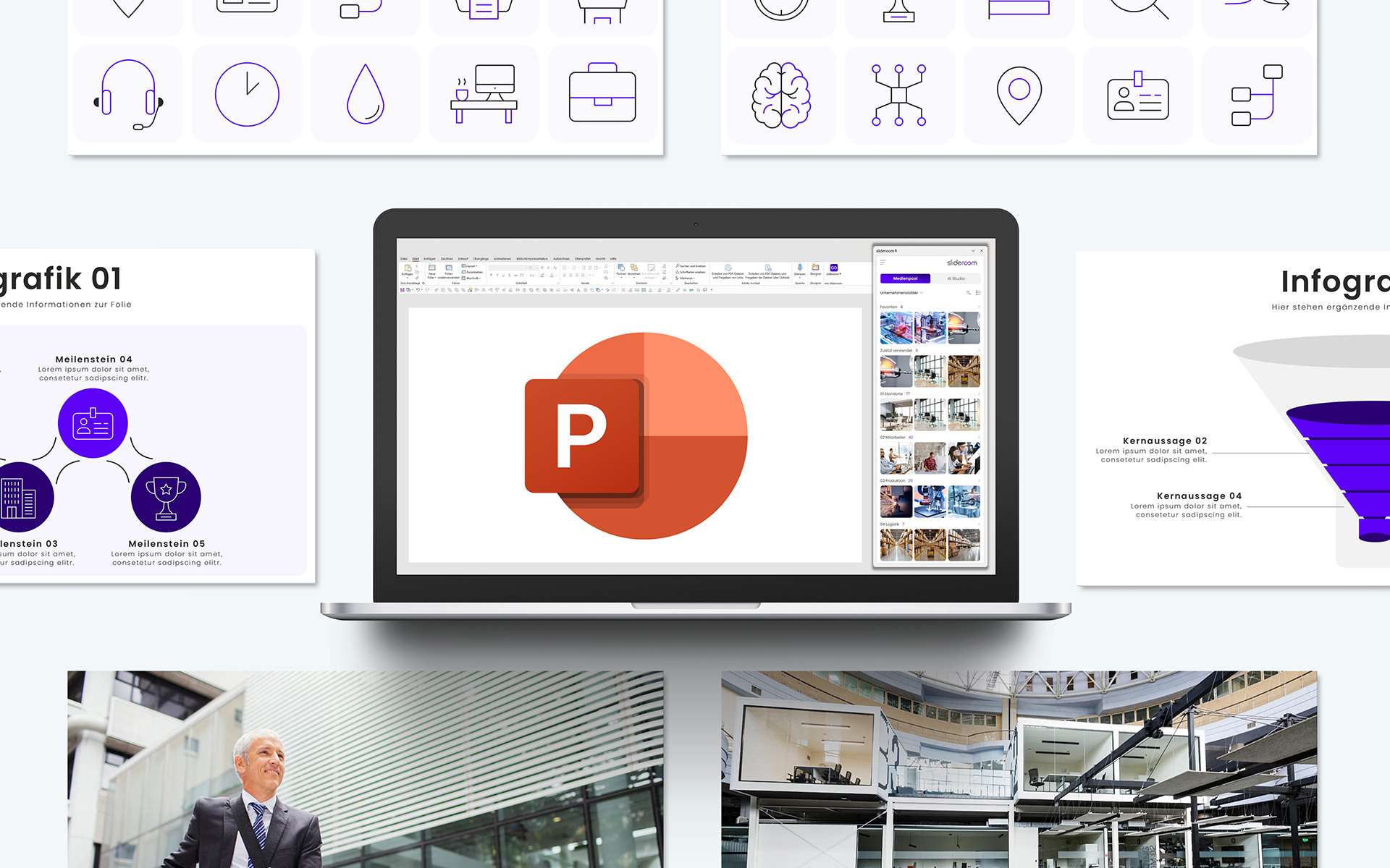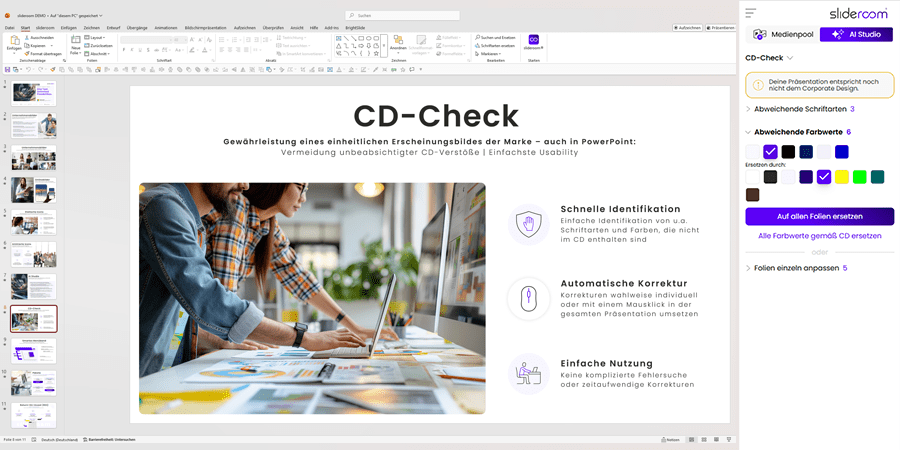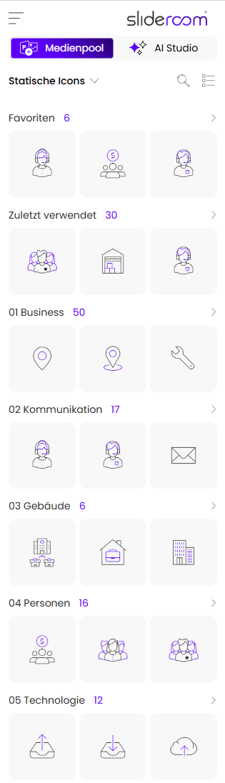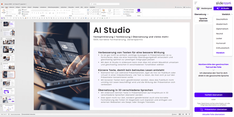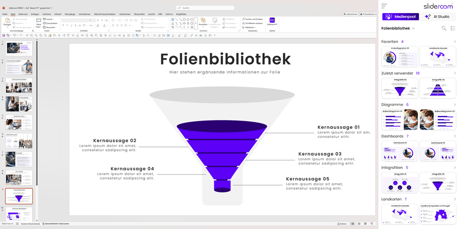 slideroom not only speeds up the creation of presentations, but also raises their quality and persuasiveness to a whole new level: with AI-optimized texts, concise key messages and a visual design through the increased use of images and icons.